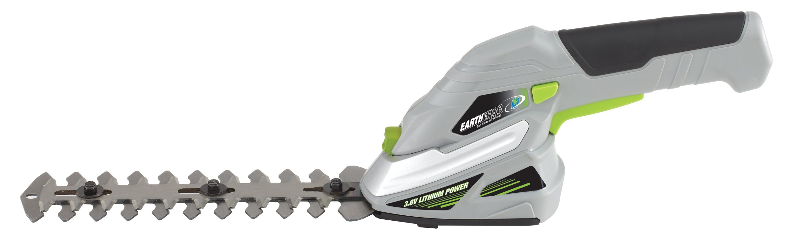 The Earthwise Cordless 3.6-Volt Lithium Garden Shear combo set is convenient, lightweight and easy to use. The two interchangeable blade system allows grass edging and hedge trimming. The quick blade changing system requires no tools. The built-in rechargeable lithium battery provides the power you need for beautiful detailing of your yard. It includes both a 6.3″ shrubbery blade and a 3″ grass shear blade to provide versatility and convenience in one tool. It’s perfect for quick touch ups or manicuring garden or flower beds. Just charge it with the included charger and go. No cords, no oil and no gas. Earthwise is The Clean Air Choice!