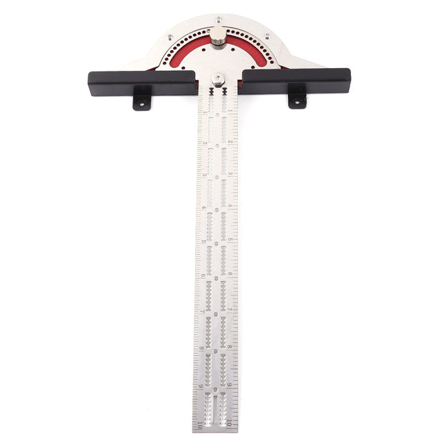 The ruler tool can beadjusted from 0° to 70°, and every 5° (plus 22-1/ 2°, 67-1/ 2°) has asteel ball to lock the anglefirmly during the painting lines; Any angle can be obtained by moving and rotating the ruler. There are 104 serrated notches and 13 circular holes, The spacing of the serrations is 11/112in (approximately equal to 2.49 mm) andthat of the round holes is 1in